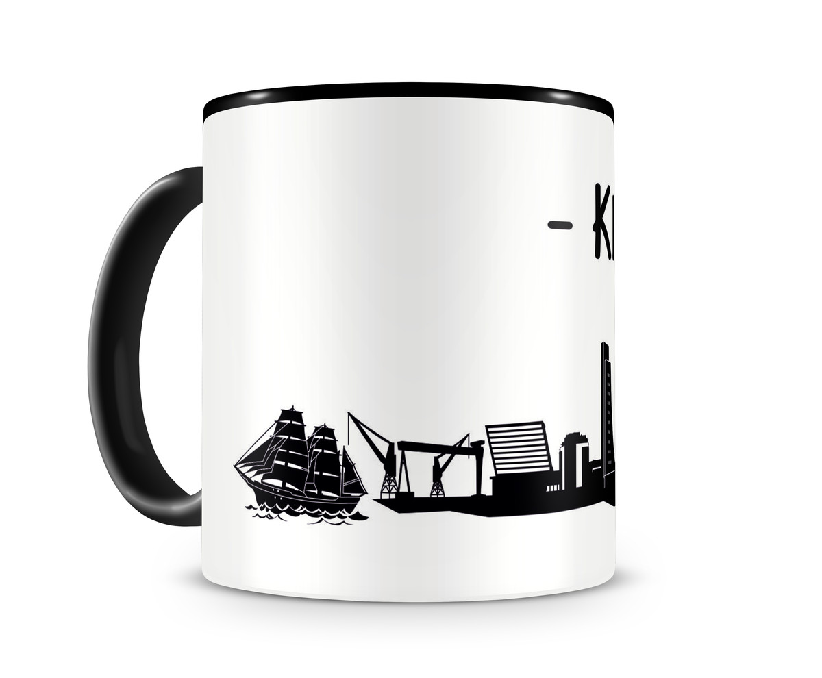 Die Stadt Kiel als Skyline aufgedruckt auf einer Tasse. Im Sublimationsdruck hergestellt. Robust und spülmaschinenfest. Aufkleber und Wandtattoos mit dem selben Motiv finden Sie in unserem Shop.