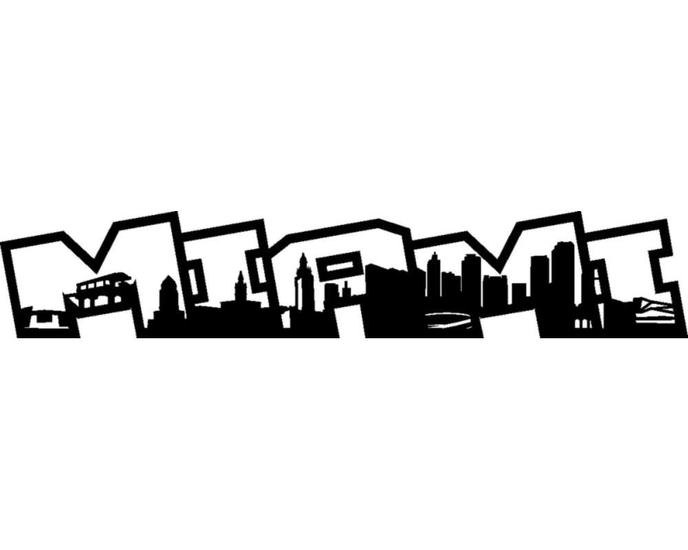 Miami Schriftzug Wandtattoo mit Skyline. Dekorativer Schriftzug mit den Sehenswürdigkeiten und Highlights der Stadt Miami. Zu sehen sind beispielsweise Villa Vizcaya, Southeast Financial Center, Wells Fargo Center und MacArthur Causeway um nur einige aufzuzählen. Der ideale Wandschmuck in Wohnzimmer oder Arbeitszimmer.