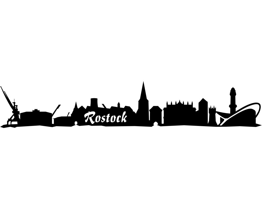 Skyline Aufkleber der Stadt Rostock. Die Hansestadt Rostock, im Bundesland Mecklenburg-Vorpommern gelegen, ist hier mit vielen historischen und bekannten Sehenswürdigkeiten und Bauwerken als stilvolle und schön designte Skyline Collage umgesetzt worden. Unter den ausgewählten Motiven sind unter anderem die Petrikirche,