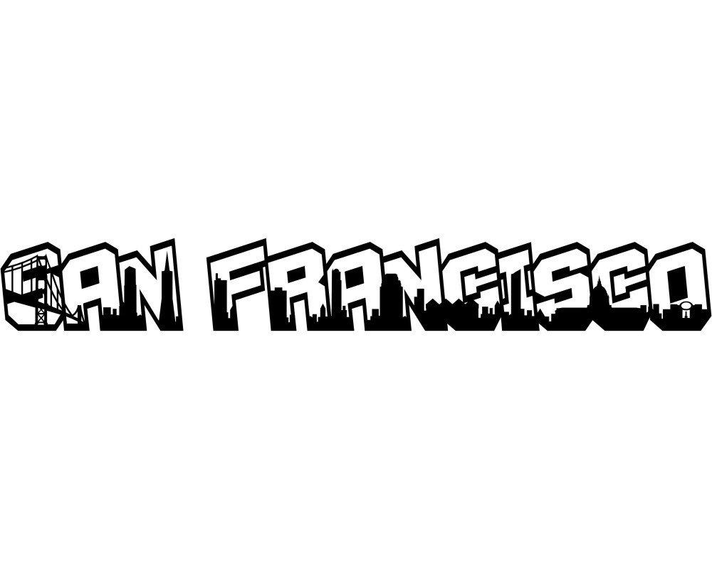 Schriftzug Aufkleber San Francisco mit integrierter Skyline. Abgebildete Sehenswürdigkeiten aus San Francisco sind unter anderem: der Millennium Tower, die Golden Gate Bridge, 100 First Plaza und das Museum of Modern Art um nur einige aufzuzählen.. Der Schriftzug Aufkleber San Francisco ist in vielen Größen- und Farbkombinationen ab 20cm Breite als Autoaufkleber, Scheibenaufkleber oder Wohnmobilaufkleber erhältlich.