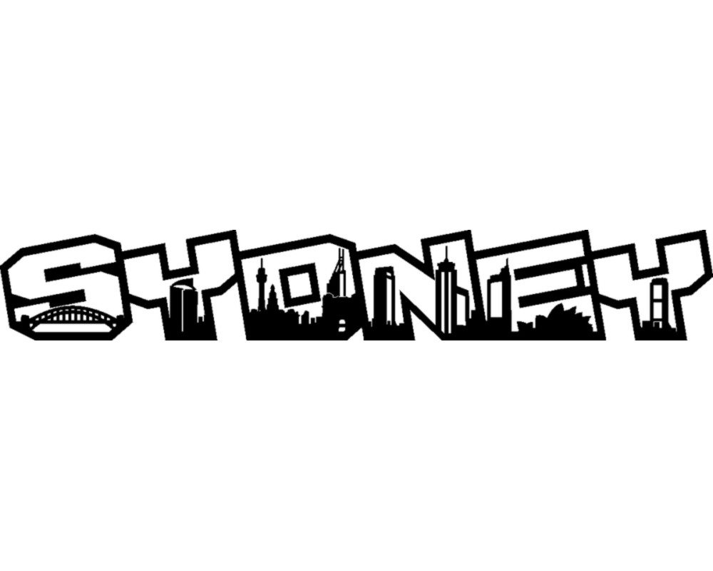 Sydney Schriftzug Wandtattoo mit Skyline. Die australische Stadt als Graffiti ähnlicher Wandaufkleber mit vielen bekannten Sehenswürdigkeiten der Stadt welche in den Schriftzug hineingesetzt wurden. In der Collage sind unter anderem zu sehen der Governor Phillip Tower, das Queen Victoria Buliding, die Harbour Bridge und das bekannte Opernhaus.